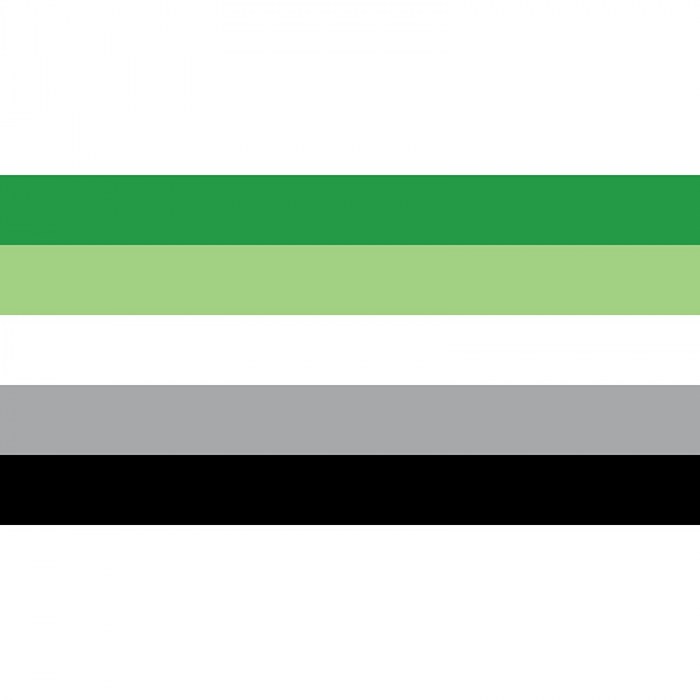The Aromantic Pride Flag is designed to represent the aromantic community: those who experience little to no romantic attraction. The stripes represent aromanticism, the aromantic spectrum, aesthetic attraction, greyromantic (romantic attraction rarely or only weakly experienced) and demiromantic people (romantic attraction only experienced after a strong emotional bond has been formed), and the sexuality spectrum.