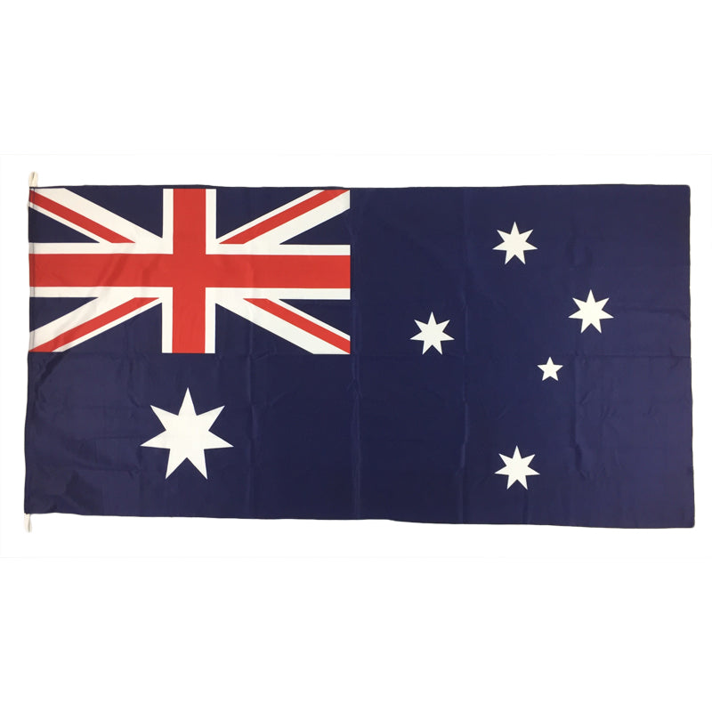 This Australian Souvenir flag is 1500mm x 750mm in size, and is printed on a single side of thin knitted polyester material, creating a mirror image on the reverse side.