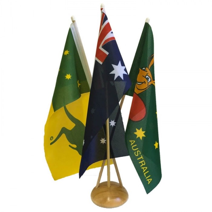 Australian Sporting Flags Desk Set, includes three handwaver flags plus wooden base.