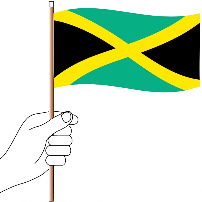 This Jamaica Handwaver is a hand flag printed on a single side of knitted polyester 300mm x 150mm in size. The design bleeds through the fabric to create a mirror image on the other side.